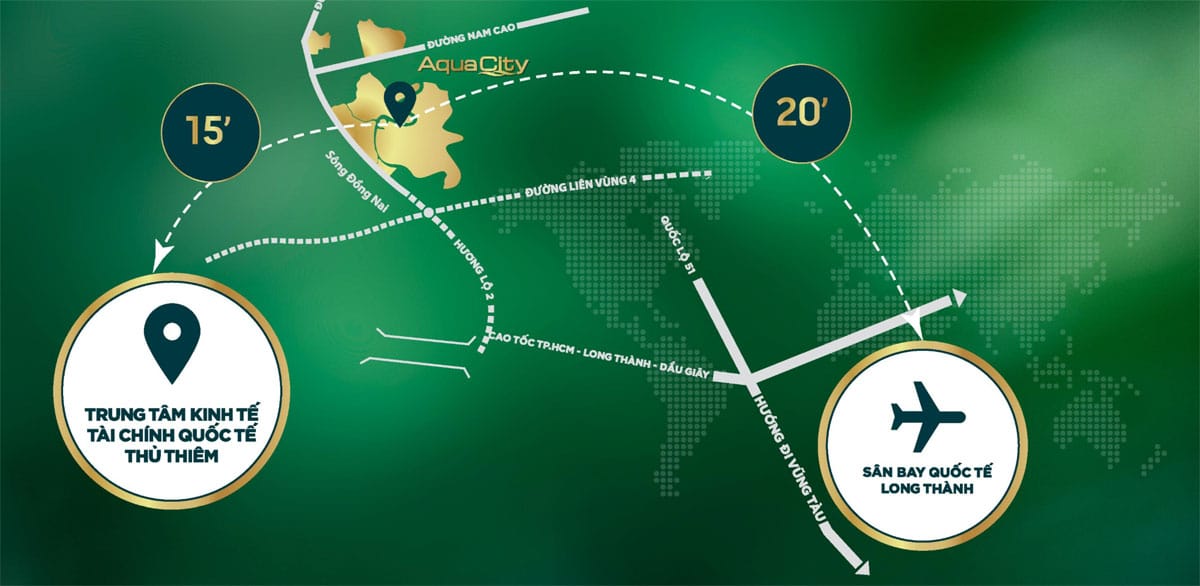Đặc biệt, khi tuyến Hương lộ 2 nối quốc lộ 51 và cao tốc TP HCM – Long Thành – Dầu Giây hoàn thành, để đến trung tâm TP HCM hay Cảng hàng không quốc tế Long Thành cư dân chỉ mất khoảng 20 phút, 10 phút đến thành phố Biên Hòa, hơn 5 phút để tới Khu công nghệ cao quận 9, TP HCM, 5 phút di chuyển đến Khu du lịch sinh thái Sơn Tiên lớn nhất Đông Nam Á