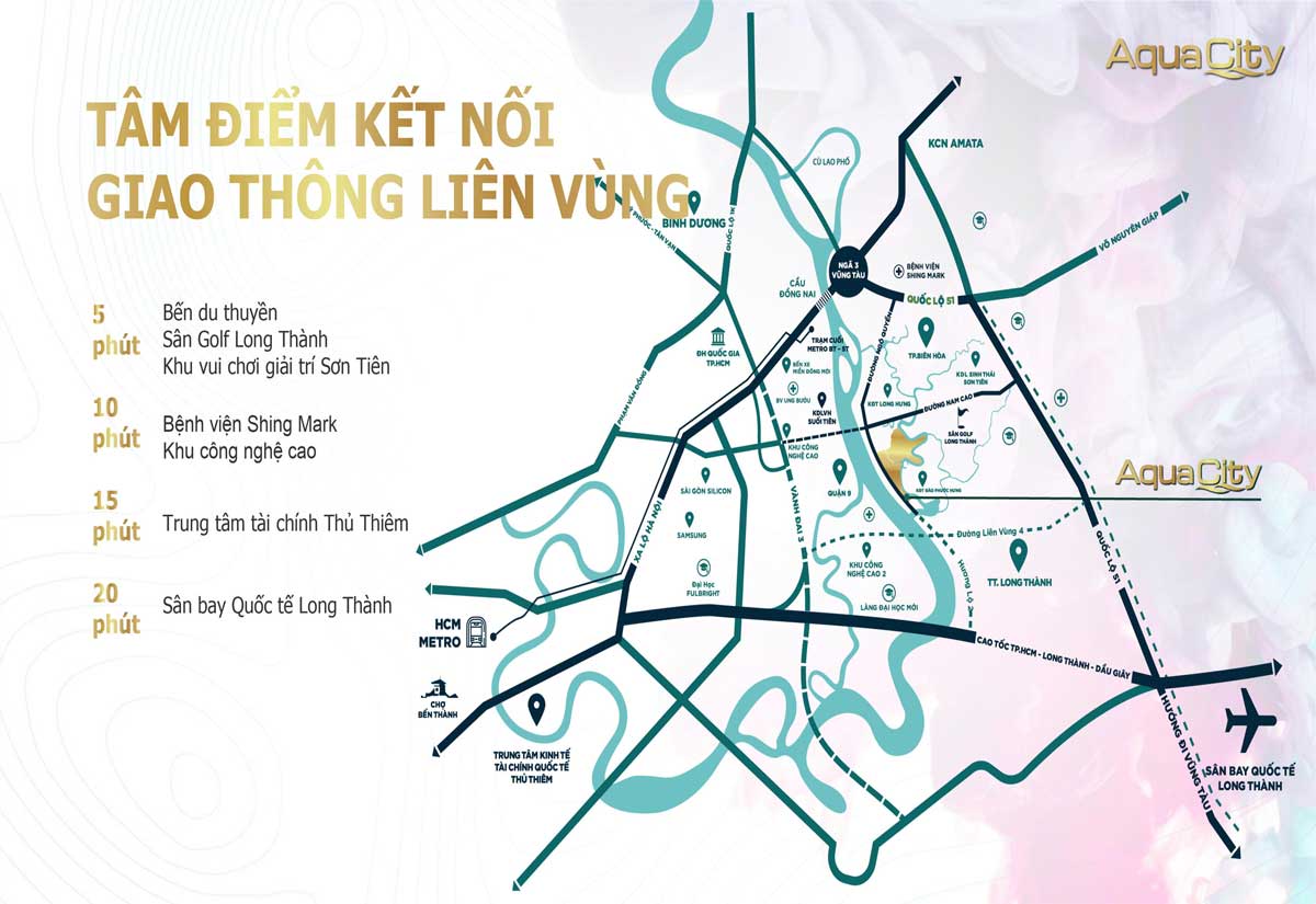 Ngoài ra, cư dân Aqua City có thể tiếp cận nhanh chóng đến Sân golf Long Thành – Được mệnh danh là sân golf đẹp nhất Việt Nam, Bệnh viện Shing Mark, đại siêu thị Aeon Mall, siêu thị Big C, trung tâm mua sắm Nguyễn Kim…